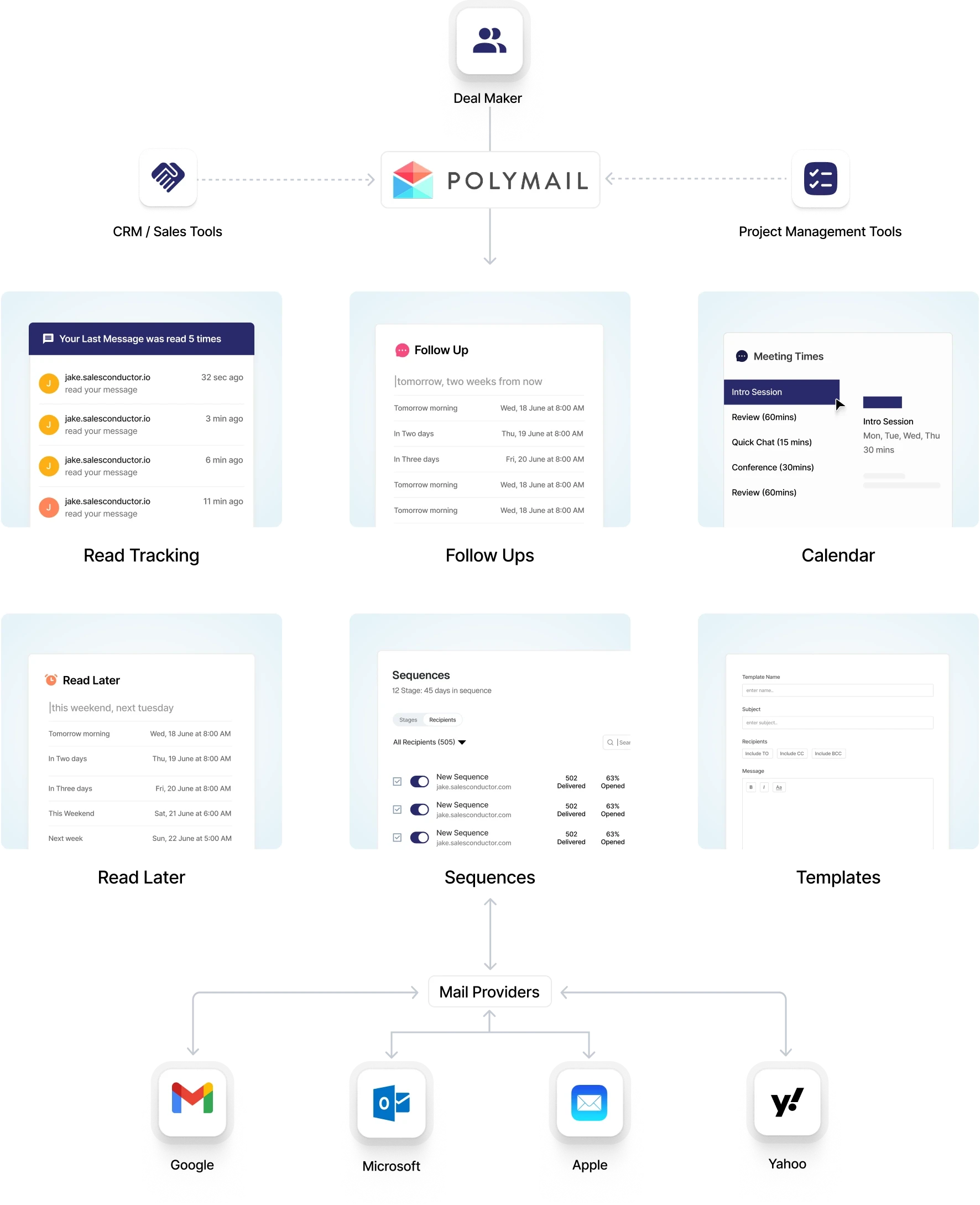 Polymail connects to your existing accounts and brings the tools you rely on — tracking, follow-ups, scheduling, and collaboration — directly into the inbox.