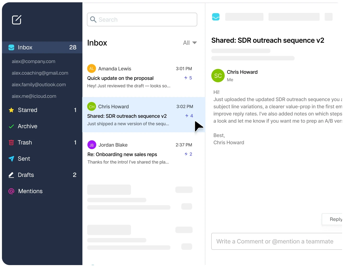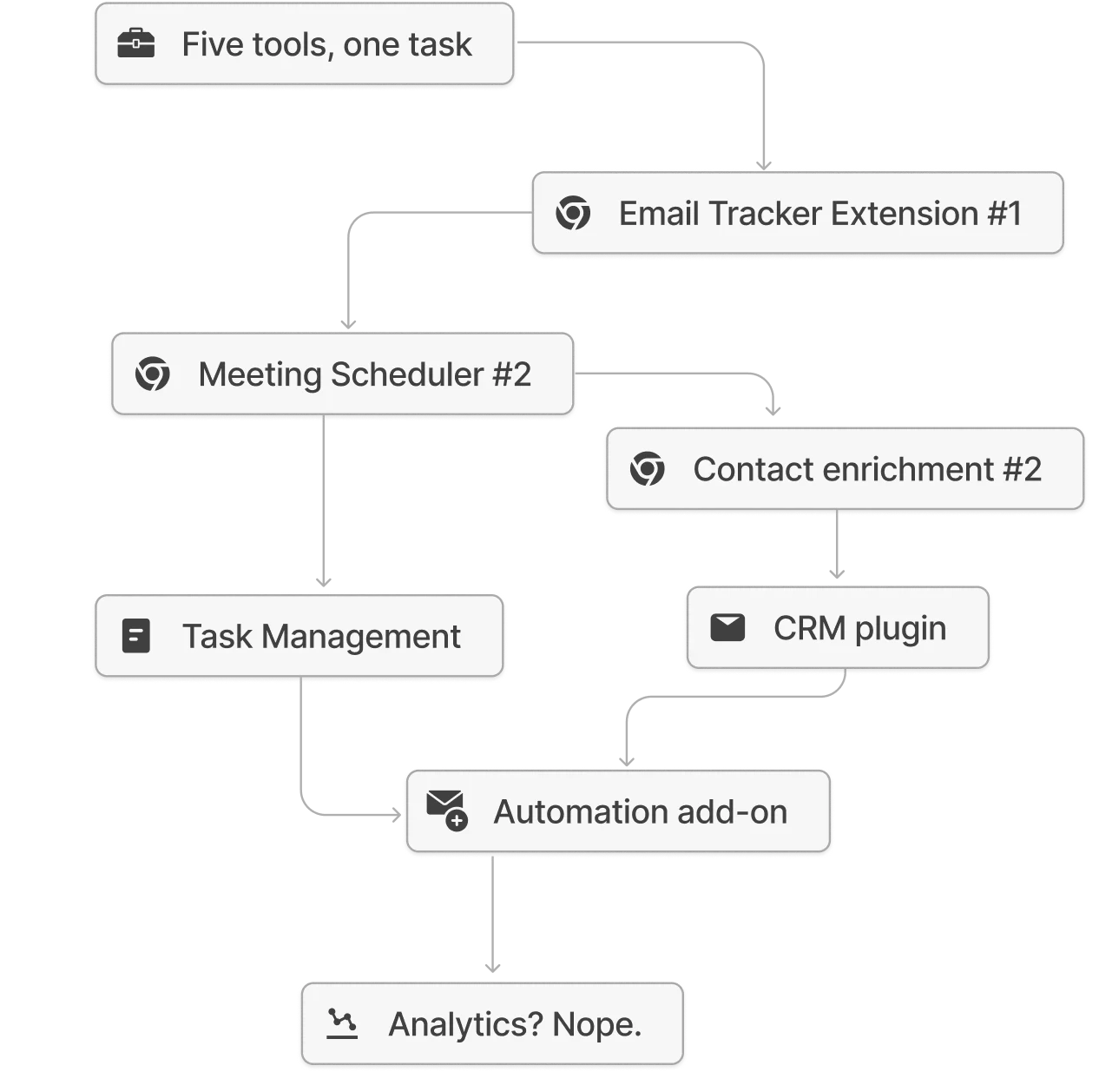Polymail connects directly to your Gmail, Outlook, or iCloud accounts. It replaces extensions, add-ons, and side tools by handling reading, follow-ups, tracking, scheduling, and organization directly inside one inbox.